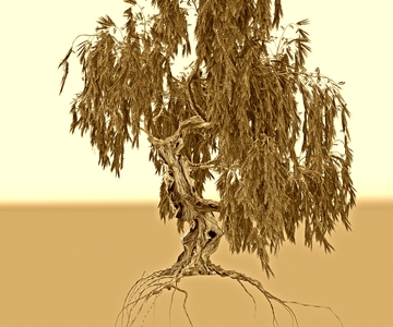 На картинке изображено дерево с изогнутым стволом и свисающими ветвями, покрытыми фиолетовыми листьями. Корни дерева видны и находятся над поверхностью, создавая впечатление, что дерево парит в воздухе. Фон картинки нейтральный, что позволяет сосредоточить внимание на самом дереве.