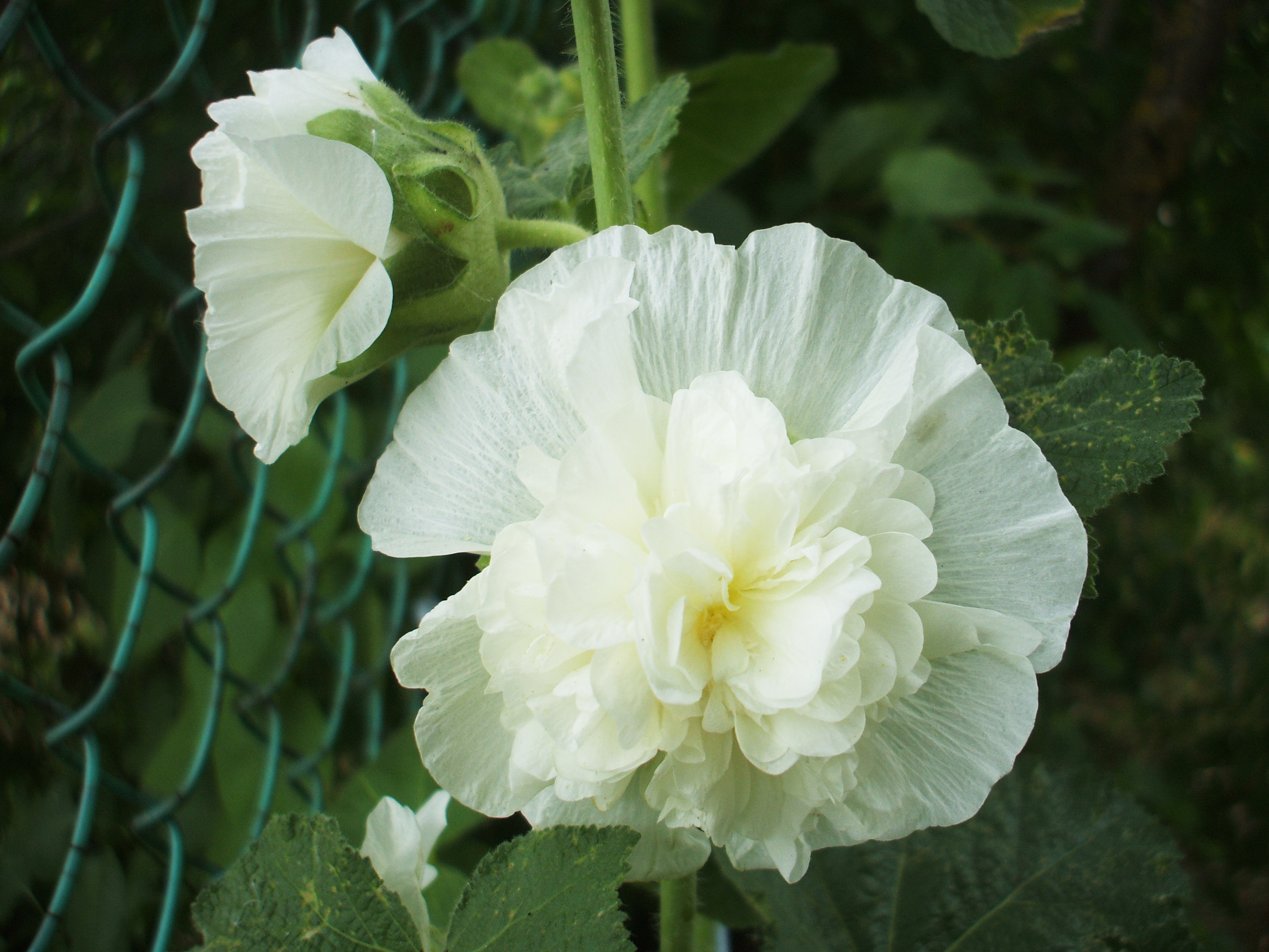 На изображении показаны два белых цветка, растущие на фоне зелёной листвы. Один цветок полностью распустился и демонстрирует свои многочисленные лепестки, а другой только начинает раскрываться. Цветы расположены рядом с зелёной металлической сеткой. Листья растения крупные и зелёные. Общий вид цветка придаёт ему нежный и утончённый вид.