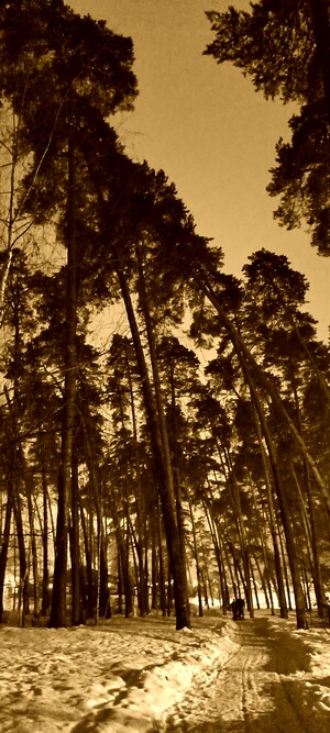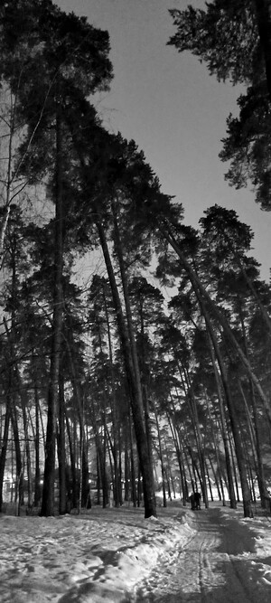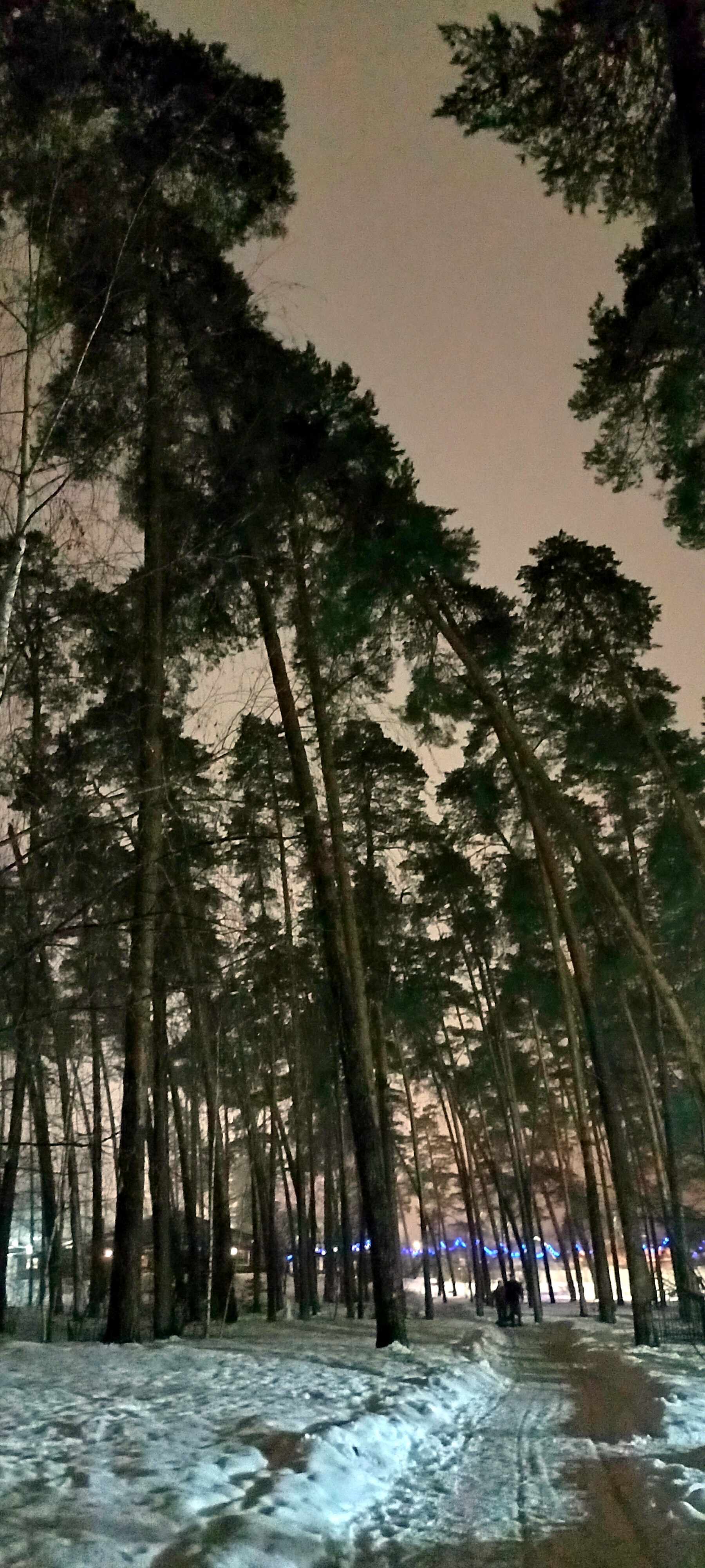 На картинке изображен зимний лес ночью. Высокие сосны тянутся вверх, их верхушки слегка наклонены. Земля покрыта снегом, по которому проложена тропинка. Вдали видны огни, возможно, от зданий или уличного освещения. Небо светлое, вероятно, из-за городского освещения или луны. В центре тропинки виднеются несколько человеческих фигур, которые идут вдоль лесной дорожки.