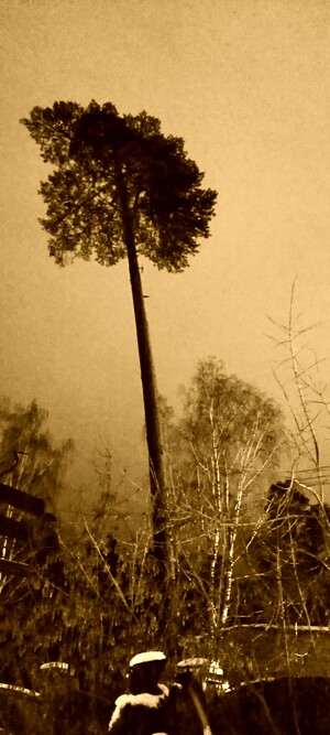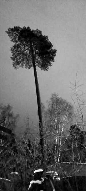 На черно-белой фотографии изображено высокое дерево с густой кроной на вершине. Дерево выделяется на фоне ночного неба. Вокруг него видны другие деревья, но они ниже и менее заметны. На переднем плане можно заметить часть конструкции или объекта, возможно, забор или крышу, покрытую снегом. Общая атмосфера фотографии напоминает зимний вечер или ночь.