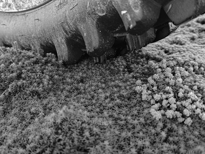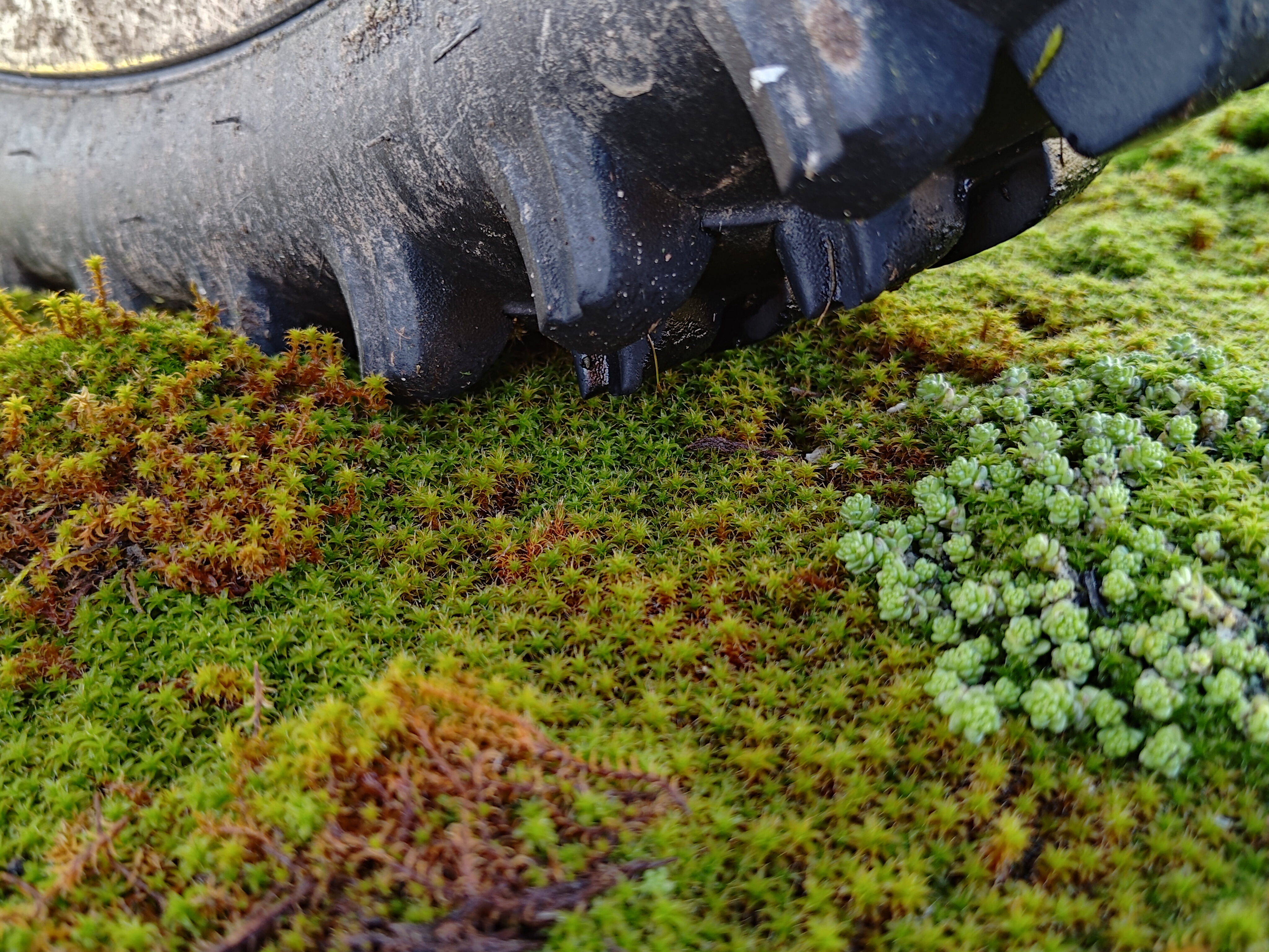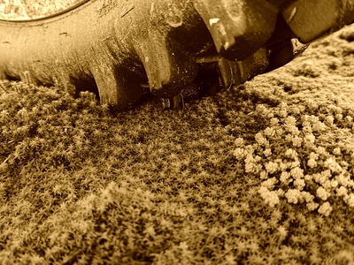 На картинке изображена часть шины с грубым протектором, которая лежит на поверхности, покрытой мхом. Мох имеет разные оттенки зелёного и коричневого, создавая текстурированный и природный фон. Шина выглядит грязной, что может указывать на её использование на пересечённой местности.
