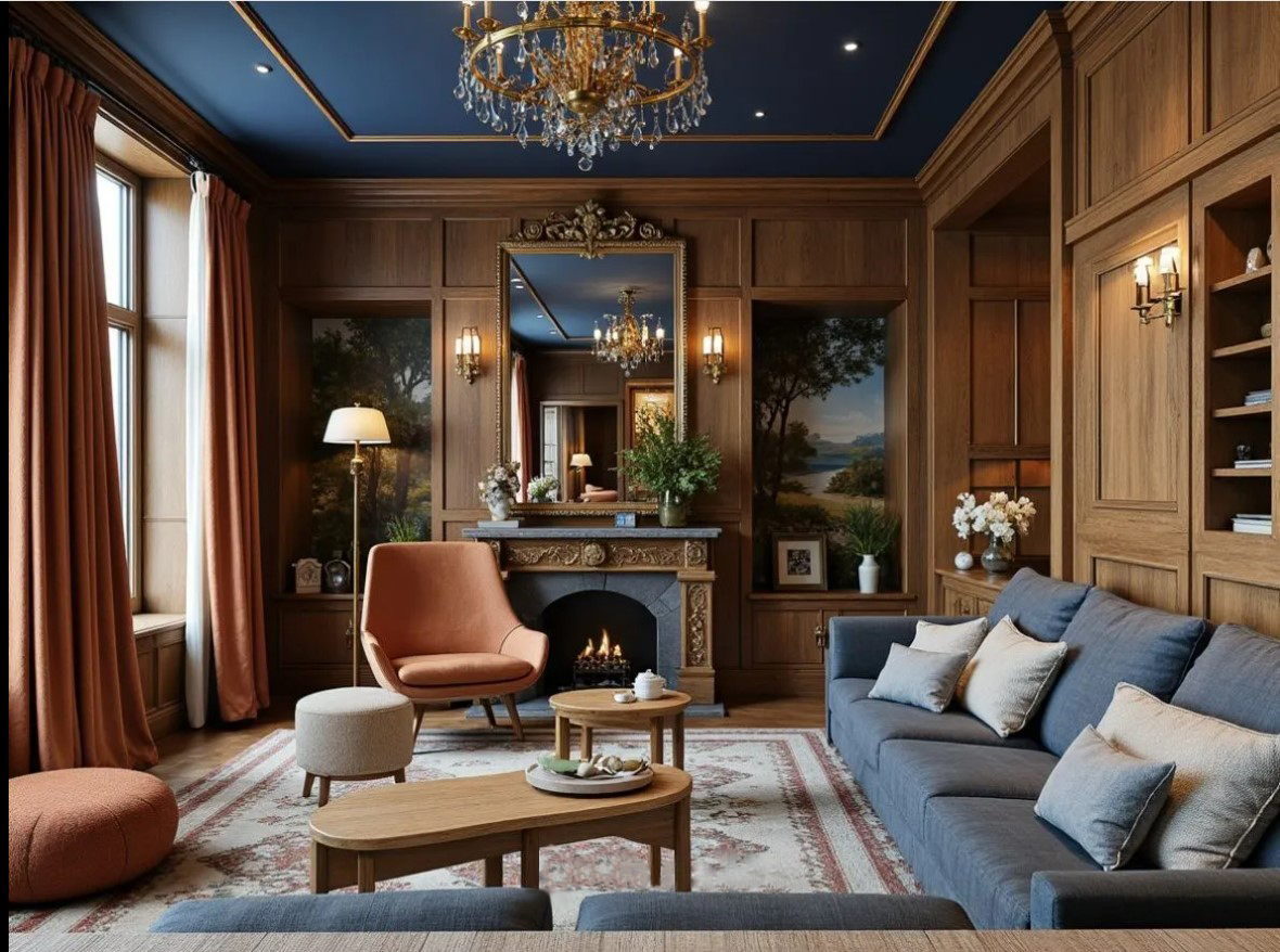 Это изображение гостиной в классическом стиле. Комната оформлена с использованием тёплых тонов и деревянных панелей. На потолке висит элегантная люстра, создающая атмосферу уюта и роскоши. В центре комнаты расположен камин с зеркалом над ним, по бокам которого находятся настенные светильники.