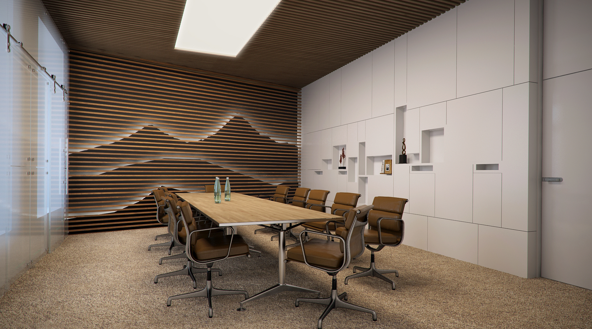 На картинке изображена современная конференц-зал. В центре стоит длинный деревянный стол, вокруг которого расположены несколько офисных кресел на колесиках. На столе стоят две стеклянные бутылки с водой.