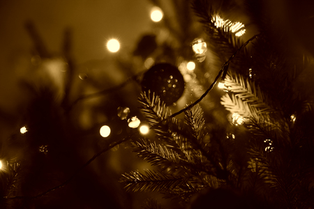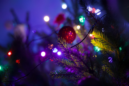 На изображении показана праздничная ёлка, украшенная разноцветными гирляндами и игрушками. В центре внимания находится красный блестящий шар, который висит на одной из веток. Вокруг него видны светящиеся огоньки гирлянды разных цветов, таких как фиолетовый, зелёный, синий и жёлтый. Ветки ёлки зелёные и пушистые, создавая ощущение праздника и уюта. Фон размытый и тёмный, что делает огоньки гирлянды и украшения более яркими и заметными.