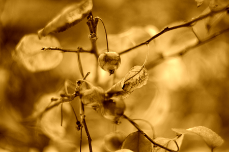 На картинке изображены ветви дерева с маленькими красными ягодами и осенними листьями. Листья имеют желтые, оранжевые и коричневые оттенки, что указывает на осенний сезон. Ягоды выглядят спелыми и сочными. Фон размытый, что привлекает внимание к ягодам и листьям на переднем плане. Общая цветовая гамма картины теплая и создает уютное осеннее настроение.
