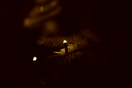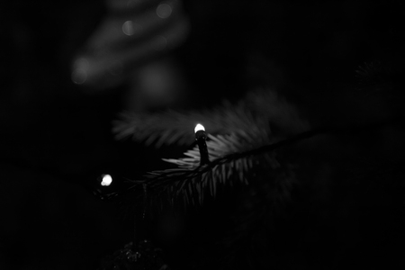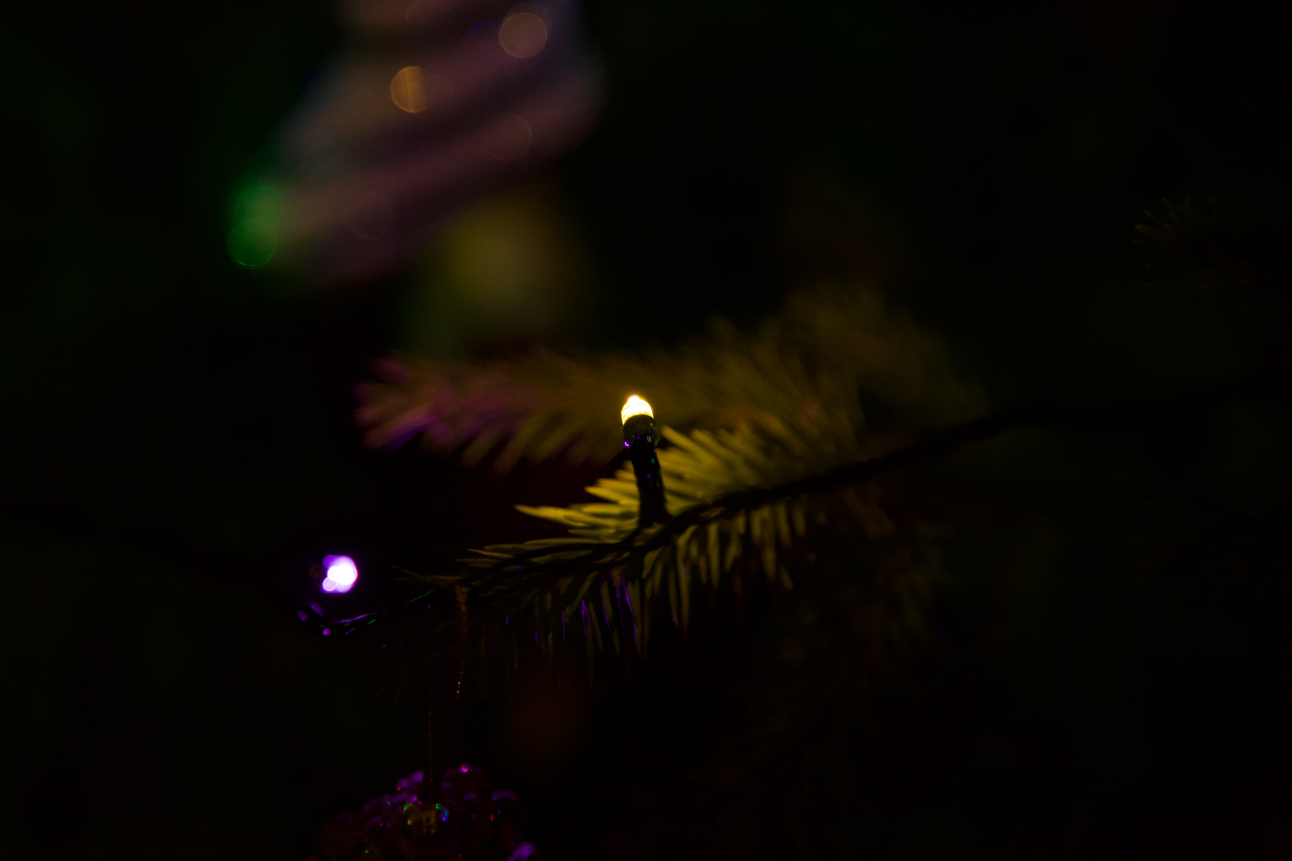 На изображении видна ветка хвойного дерева, украшенная гирляндой. В темноте заметны несколько маленьких огоньков разного цвета, один из которых ярко-желтый, а другой фиолетовый. Фон картинки темный, что подчеркивает свечение огоньков.