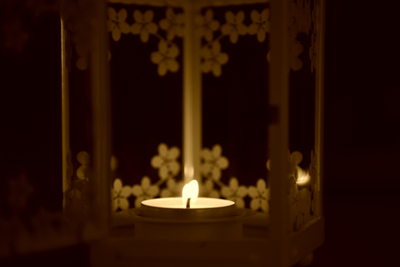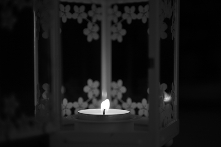 На картинке изображен небольшой горящий свечной огарок, помещенный в декоративный фонарь. Фонарь украшен цветочными узорами и имеет стеклянные стенки. Свеча горит мягким, теплым светом, создавая уютную и спокойную атмосферу. Вокруг свечи преобладает темный фон, который подчеркивает свет свечи и усиливает ощущение уюта.