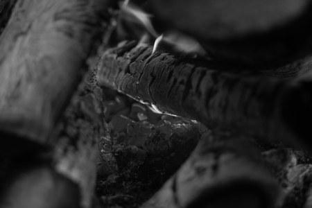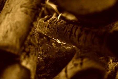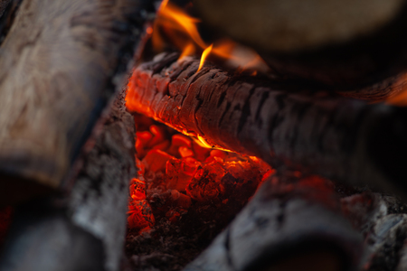 На картинке изображены горящие поленья в костре. Видны яркие оранжево-красные угли, которые светятся жаром. Огонь охватывает поленья, создавая теплое и уютное свечение. Дерево частично обуглилось, а некоторые части еще целы. Вокруг углей и поленьев видны следы пепла и обгоревших остатков древесины.