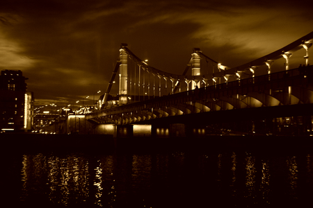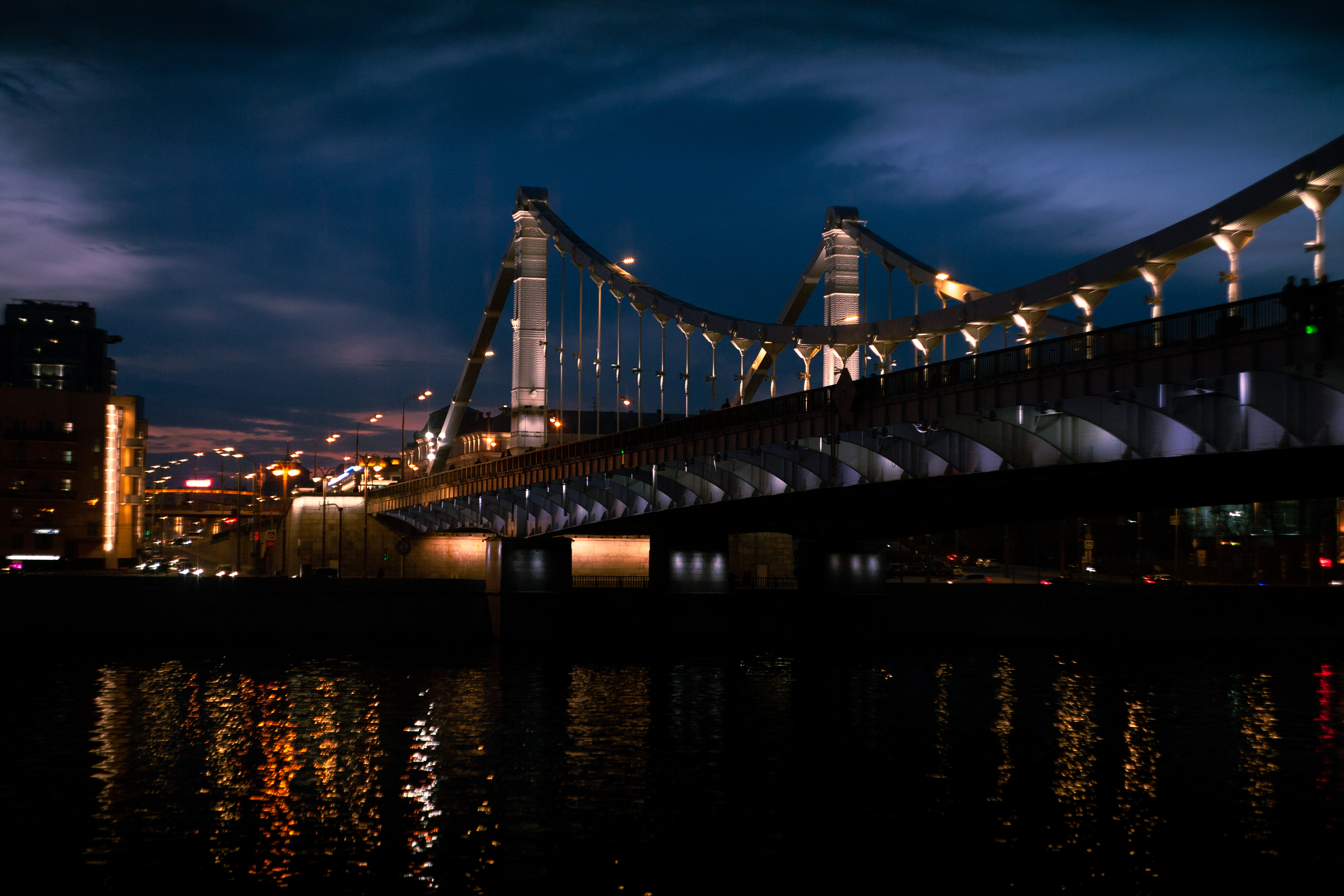 На картинке изображен мост в вечернее время. Мост освещен искусственным светом, что придает ему яркость и выделяет его на фоне темного неба. Под мостом видна река, на поверхности которой отражаются огни города и самого моста. Вдалеке можно увидеть городские здания, также освещенные огнями. Небо темное, с небольшими облаками, создающими атмосферу ночного города.