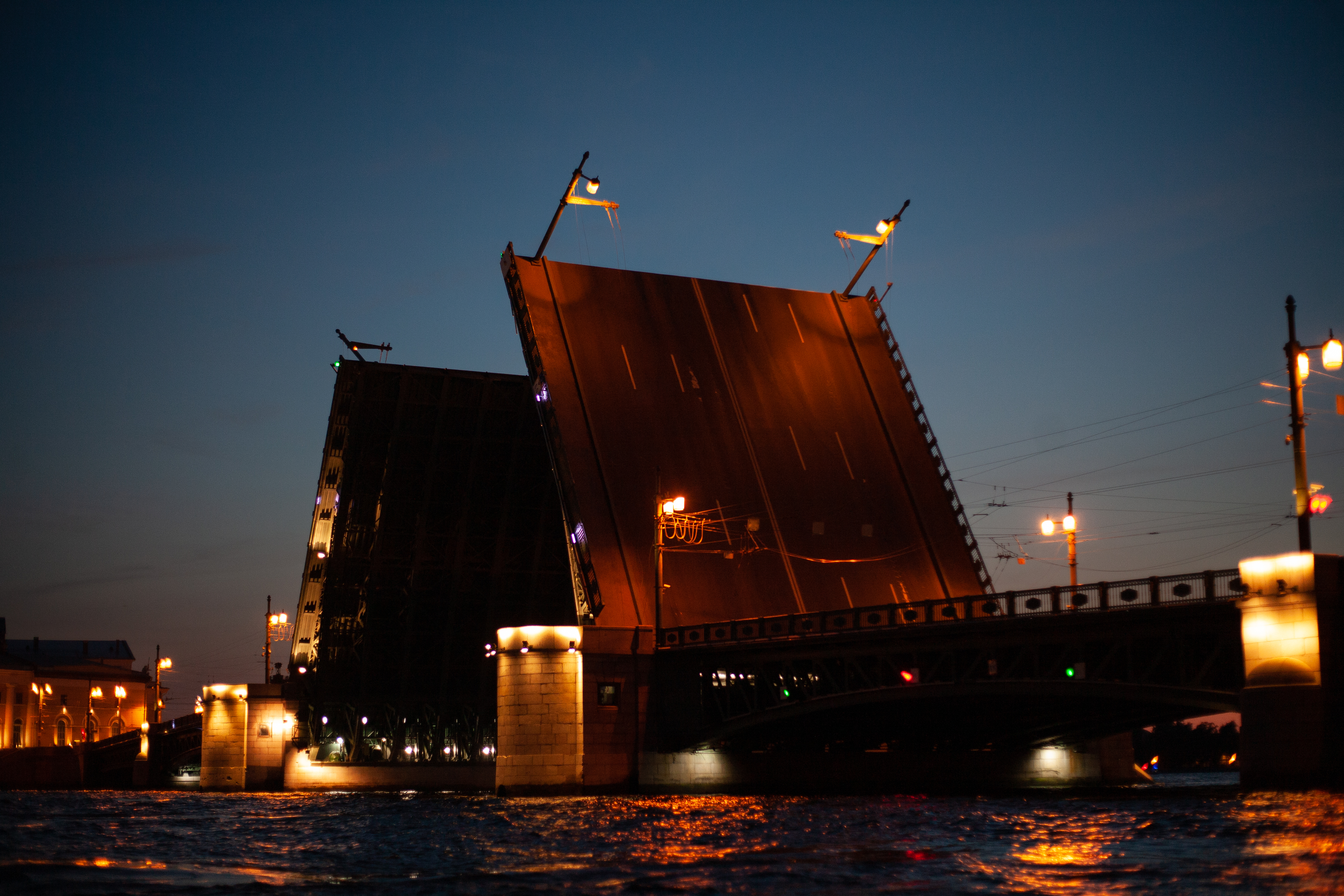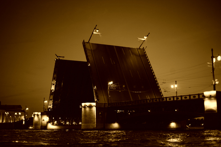 На картинке изображен разводной мост в ночное время. Две половины моста подняты, чтобы пропустить под ним судно. Мост подсвечен огнями, которые отражаются на воде. На заднем плане виднеется ночное небо. Вокруг моста также видны огни города, создающие атмосферу ночного города.