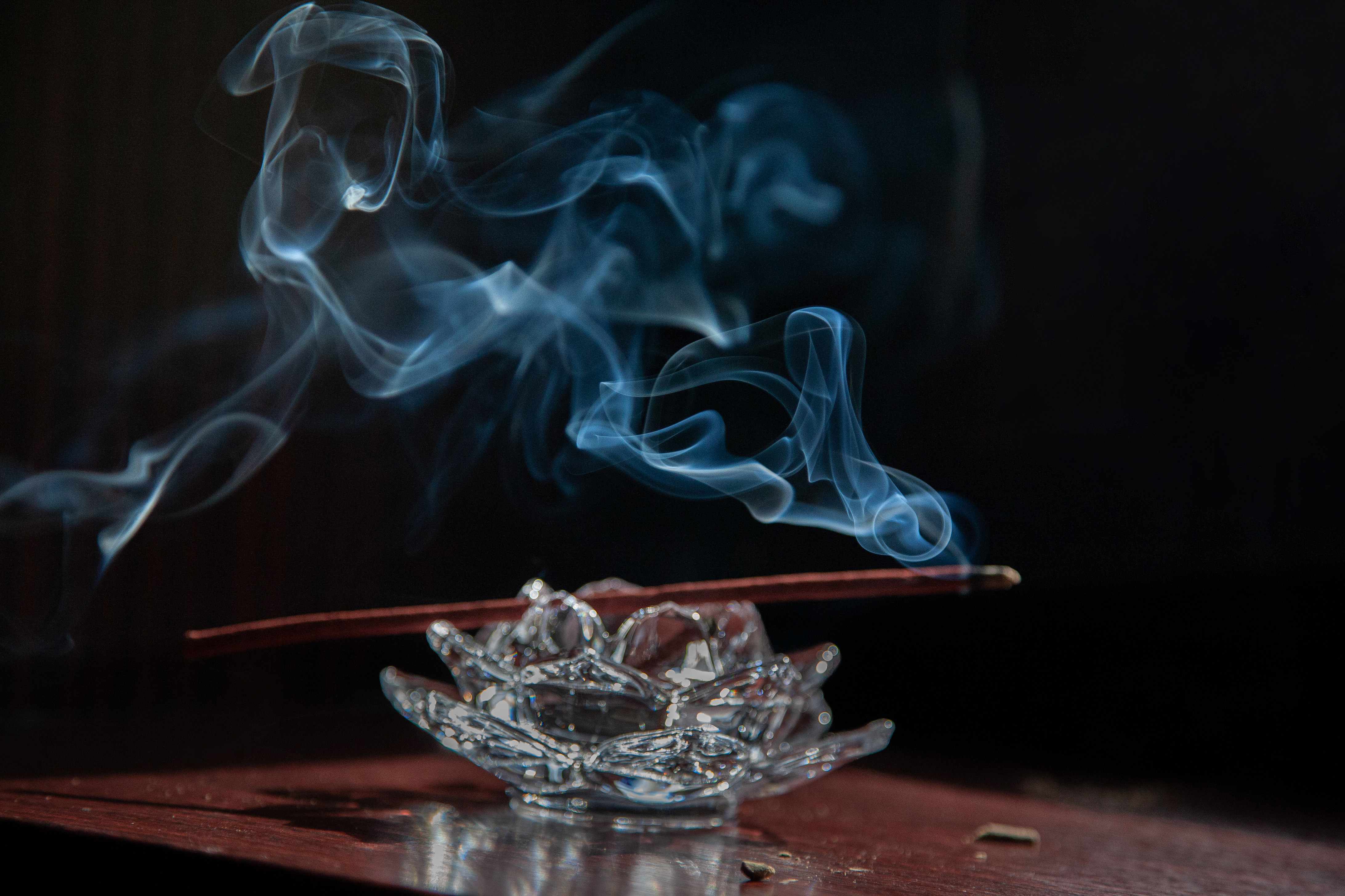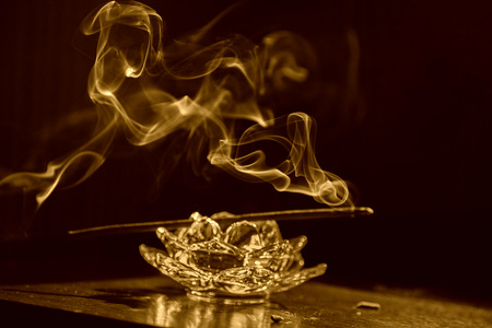 На картинке изображена горящая ароматическая палочка, установленная в стеклянную подставку, напоминающую цветок. От палочки поднимается дым, который красиво изгибается и образует плавные линии в воздухе. Фон темный, что подчеркивает светлый дым и делает его более заметным. Подставка и палочка находятся на деревянной поверхности.