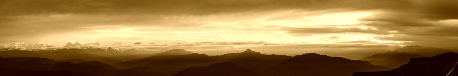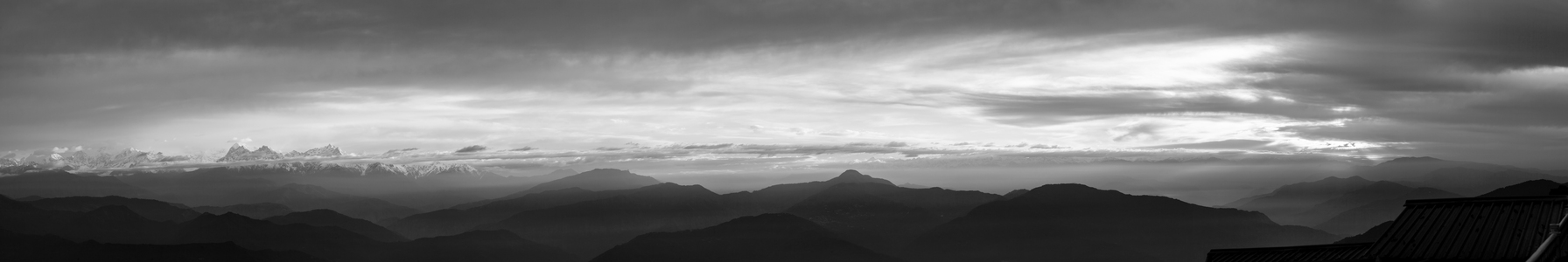 На этой панорамной фотографии изображены горы, окутанные утренним или вечерним светом. Вдали видны заснеженные вершины, которые освещены мягким светом, пробивающимся сквозь облака. Небо покрыто облаками, создающими драматичные оттенки от светло-голубого до темно-серого. На переднем плане видны тёмные силуэты горных хребтов, которые постепенно переходят в более светлые оттенки по мере удаления. В правой части изображения видна крыша здания, что добавляет контекста и масштаба к общей картине.