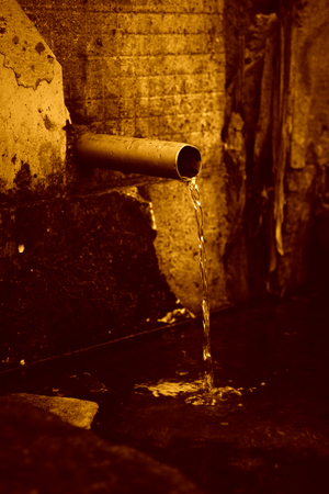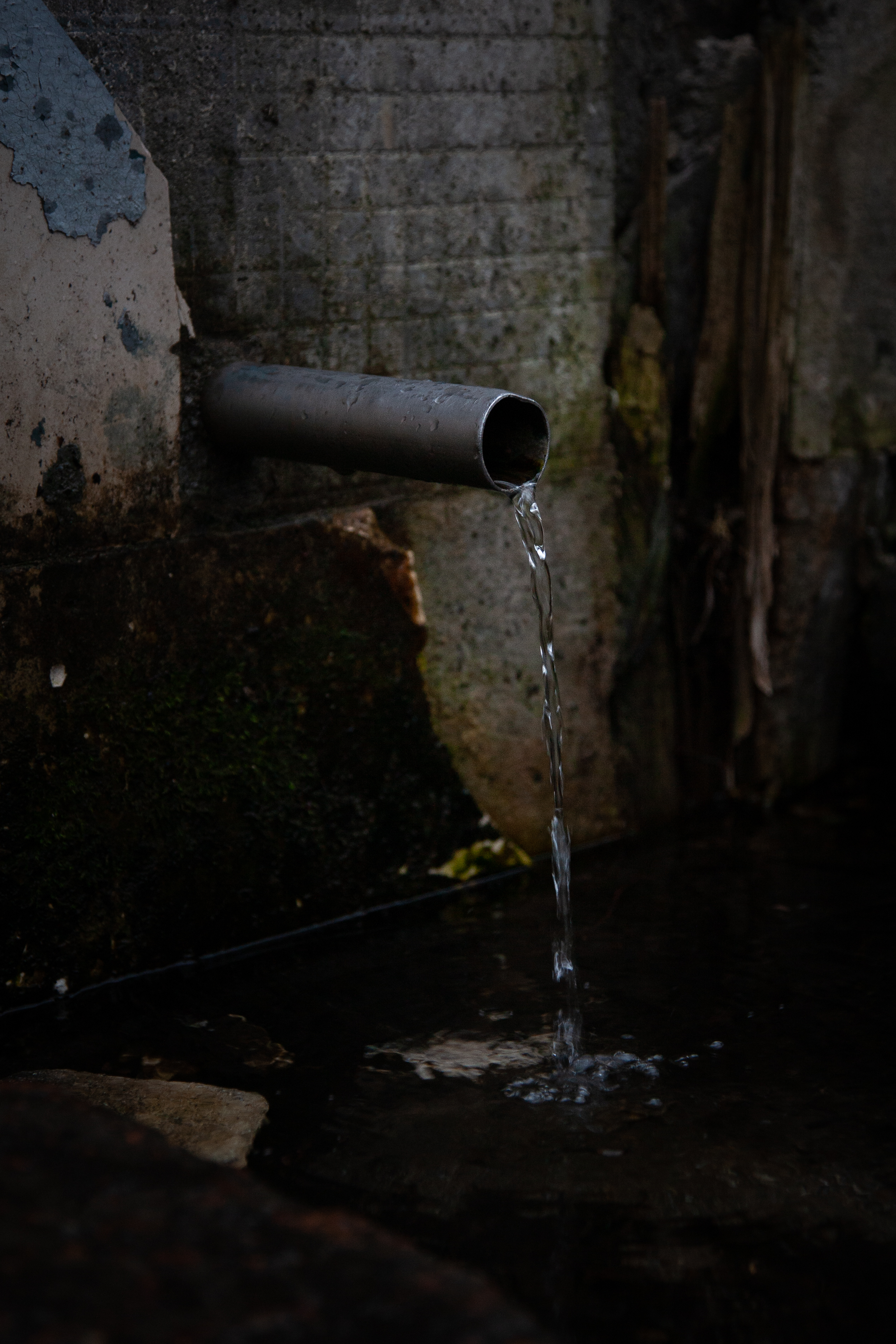 На изображении показана металлическая труба, из которой течёт вода. Труба установлена в бетонной стене, на которой видны следы времени и износа. Вода вытекает из трубы и падает вниз, образуя небольшие брызги. Вокруг трубы и на стене видны следы мха и влажности, что указывает на постоянное присутствие воды в этом месте. На переднем плане можно заметить камни и воду, в которую падает струя. Общий вид создает ощущение заброшенности и сырости.