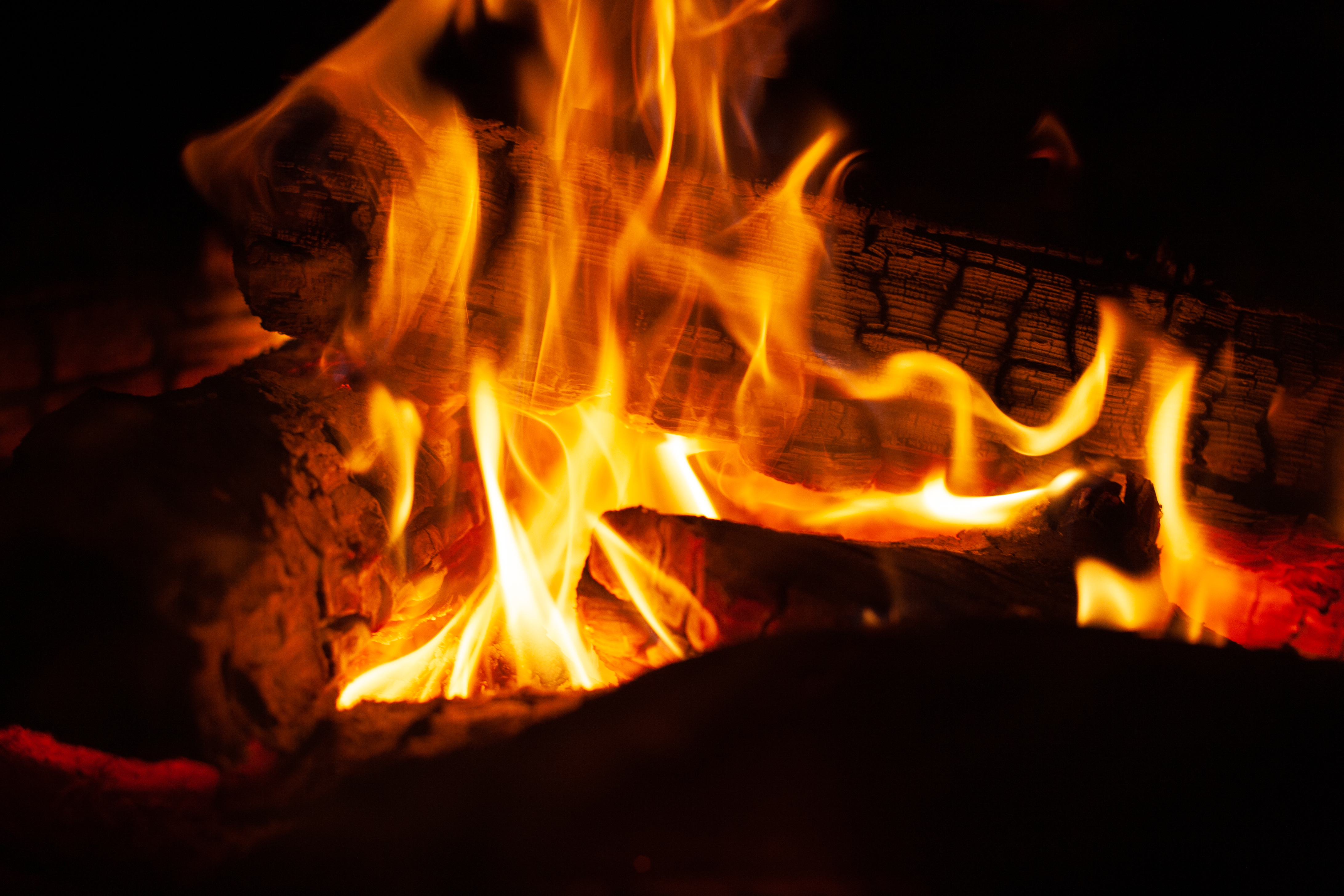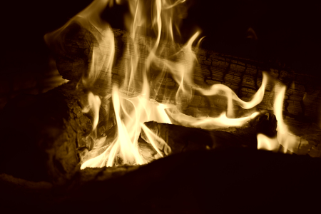 На картинке изображен огонь, горящий в темноте. Пламя яркое, с различными оттенками желтого и оранжевого цветов. Видны горящие дрова, которые постепенно превращаются в угли. Огонь создает ощущение тепла и уюта, а также динамики благодаря языкам пламени, которые извиваются и поднимаются вверх. Тёмный фон подчёркивает яркость и контрастность пламени.