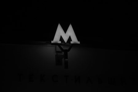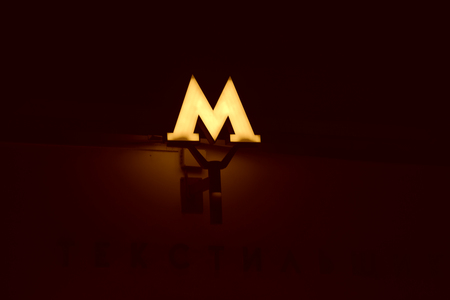 На картинке изображен светящийся знак московского метрополитена в форме буквы "М". Знак ярко освещен красным светом и расположен на темном фоне. Под знаком видна часть надписи на русском языке, которая гласит "ТЕКСТИЛЬЩИКИ", что, вероятно, является названием станции метро.