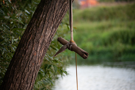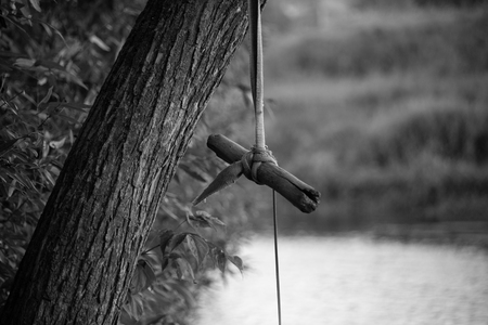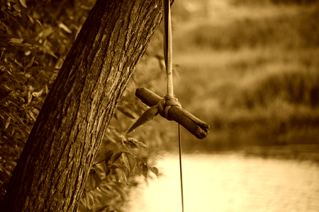 На картинке изображено дерево, к которому привязана самодельная качель. Качель сделана из веревки и перекладины из дерева. Веревка привязана к ветке дерева, а сама перекладина находится на уровне, удобном для сидения. На заднем плане виднеется водоем и зеленая растительность. Обстановка выглядит спокойной и природной.