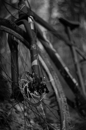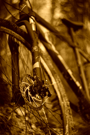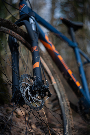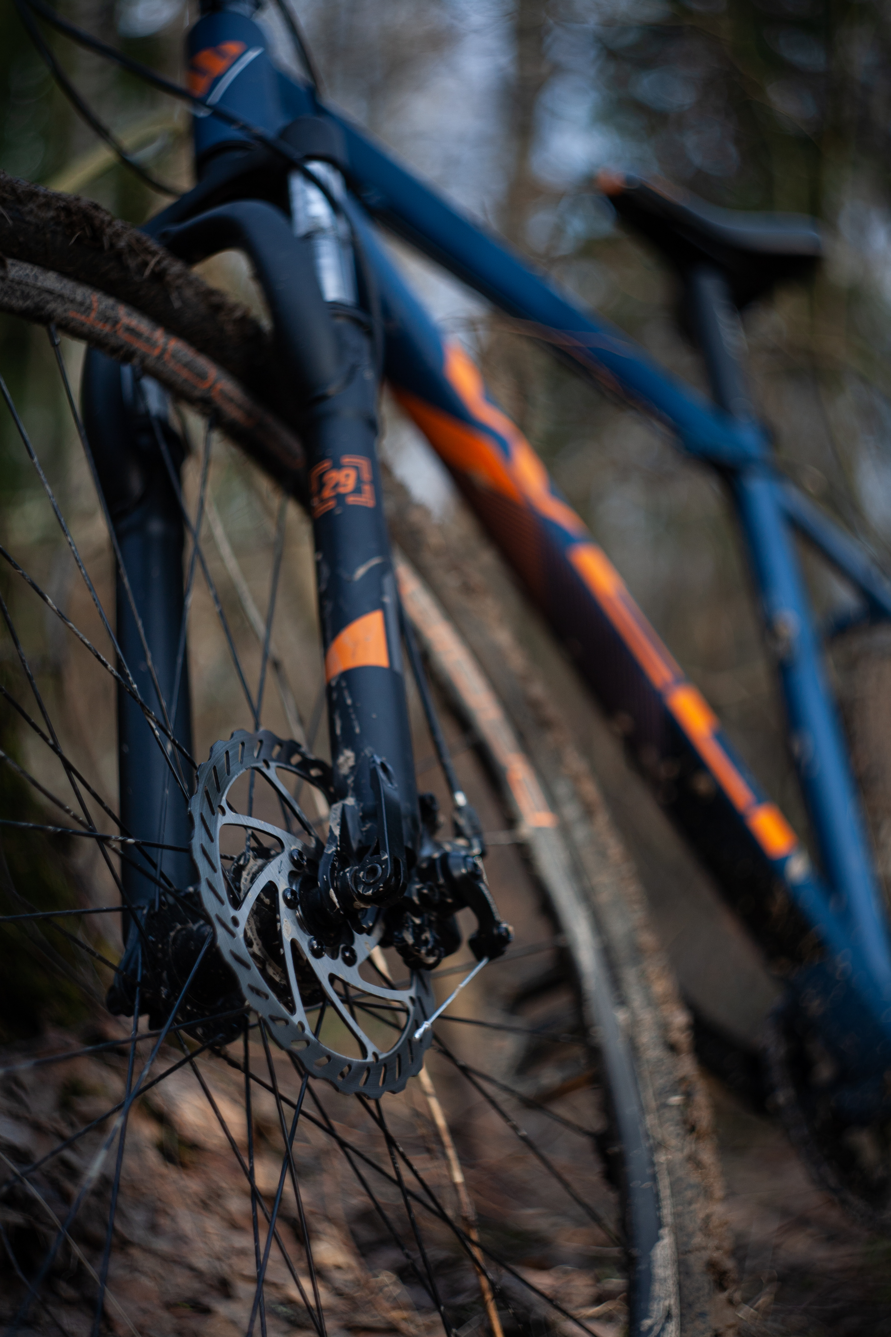На картинке изображен велосипед, стоящий на лесной тропинке. Велосипед имеет синий цвет с оранжевыми акцентами и оснащен дисковыми тормозами. Колеса велосипеда покрыты грязью, что свидетельствует о том, что он использовался в условиях бездорожья. Фон изображения размытый, на нем можно различить деревья, что указывает на лесную местность.