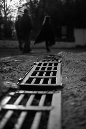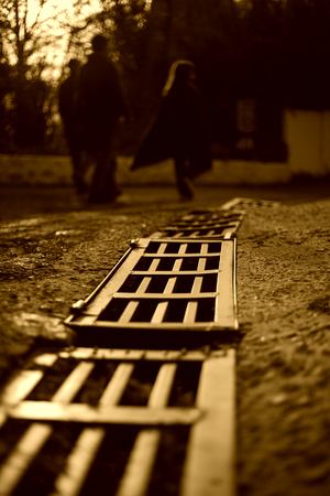 На картинке изображена дренажная решетка, расположенная на дороге или тротуаре. На переднем плане видно металлическую решетку, которая постепенно уходит вдаль, создавая перспективу. На заднем плане, в расфокусе, видны несколько людей, идущих по дороге. Один из них выделяется на фоне, вероятно, благодаря освещению, которое подчеркивает его силуэт. Вечернее или утреннее солнечное освещение создает длинные тени и придает картинке теплый оттенок. На заднем плане также можно увидеть деревья и, возможно, часть здания.