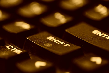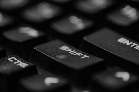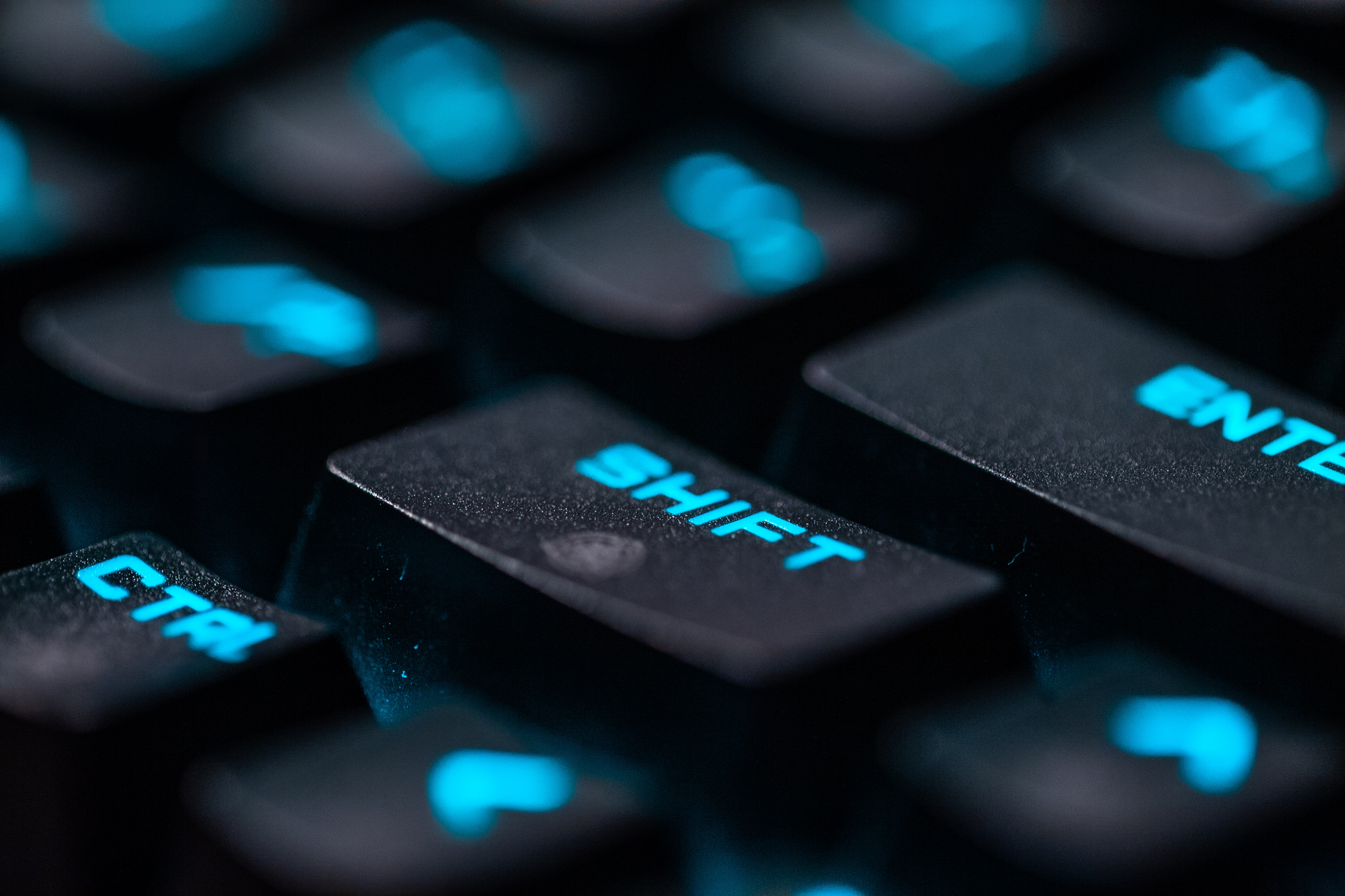 На картинке изображена клавиатура с подсветкой, на которой выделены клавиши "SHIFT", "ENTER" и "CTRL". Подсветка клавиш имеет голубой цвет, что создает яркий контраст с черными клавишами. Изображение выполнено с близкого расстояния, что позволяет увидеть текстуру клавиш и детали их поверхности.