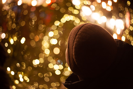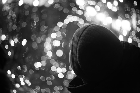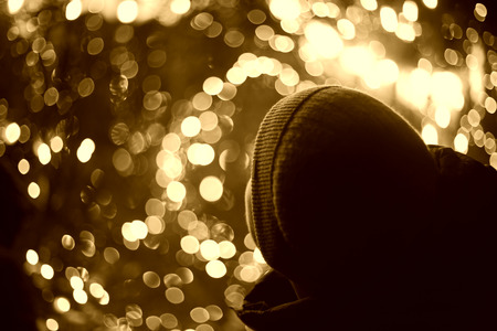 На картинке изображена голова человека в шапке, который смотрит на яркие огни. Фон состоит из множества размытых светящихся точек, создающих эффект боке. Эти огни, вероятно, являются частью праздничного освещения, создавая теплую и волшебную атмосферу. Человек находится в тени, и его лицо не видно.