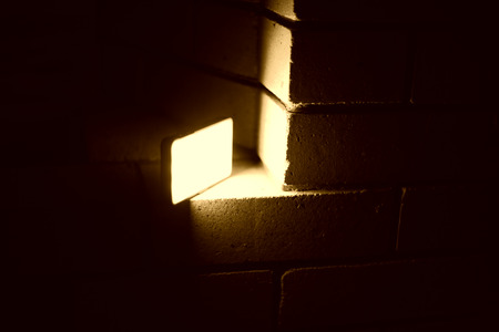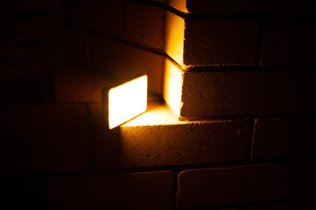 На изображении видно кирпичную стену, освещённую ярким источником света. Светильник, излучающий тёплый жёлтый свет, расположен в углу стены, создавая интересную игру света и тени на кирпичной поверхности. Освещённая часть стены выглядит ярко, а остальная часть погружена в тень, что создаёт контраст и атмосферу уюта.