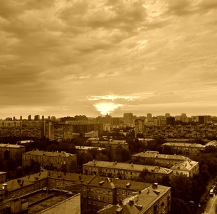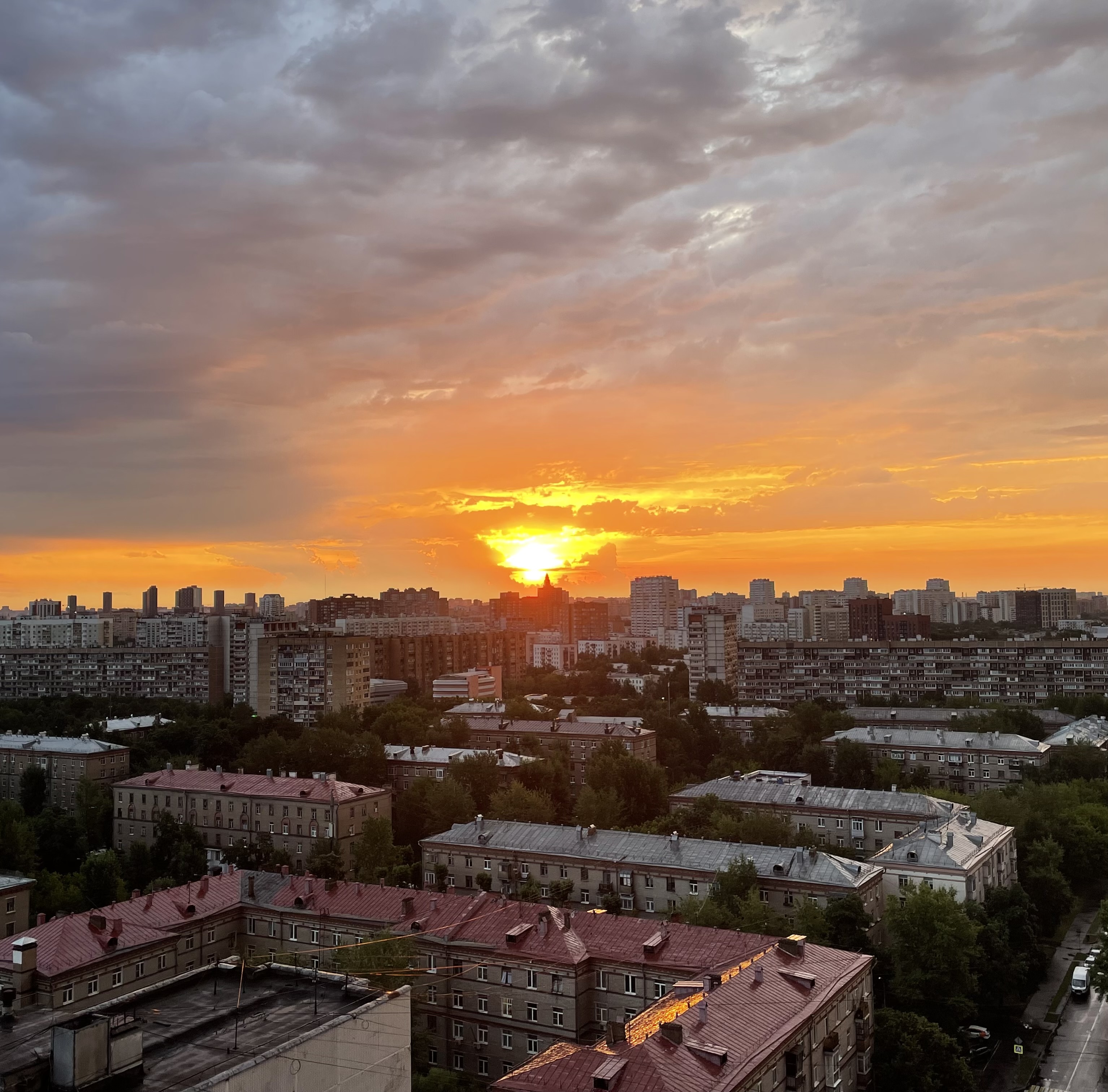 На картинке изображен городской пейзаж во время заката. Солнце находится низко над горизонтом, окрашивая небо в яркие оттенки оранжевого и желтого. Небо частично покрыто облаками, которые добавляют драматичности сцене. Внизу видны крыши зданий с красными крышами и зеленые деревья, растущие между домами. Вдалеке можно увидеть более высокие здания, что создает ощущение глубины и перспективы. Общая атмосфера изображения спокойная и умиротворяющая.