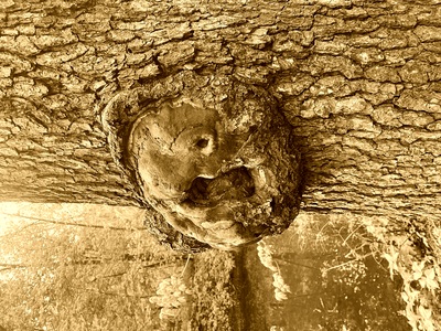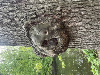 На картинке изображен ствол дерева с необычным наростом, который по форме напоминает лицо животного. Дерево находится рядом с водоемом, на заднем плане видна вода и зеленая растительность. Листва на деревьях свежая и зелёная, что может указывать на весенний или летний сезон. Нарост на дереве выглядит массивным и имеет грубую текстуру.