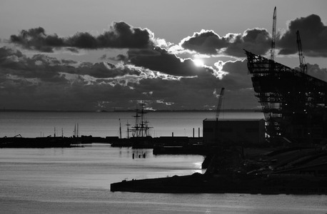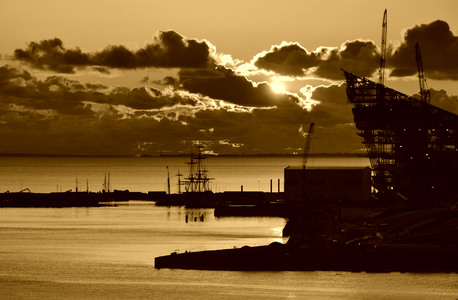 На картинке изображен порт в вечернее время суток. Солнце садится за горизонт, создавая красивый закат с яркими оранжевыми и золотистыми оттенками, которые отражаются на облаках и воде. В портовой зоне видны несколько кранов и строений, а также силуэты кораблей с мачтами. Вода в гавани спокойная, и на переднем плане можно увидеть пристани и различные строения. Общая атмосфера картины спокойная и умиротворяющая, подчеркивающая красоту заката и индустриальный пейзаж порта.