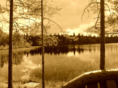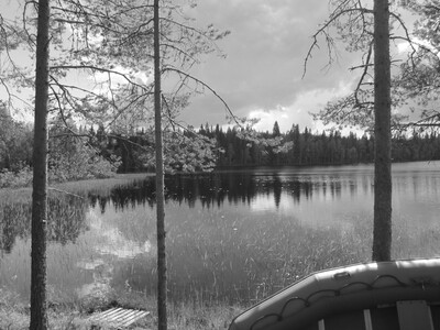 На картинке изображен живописный пейзаж с видом на озеро. Вода в озере спокойная и отражает небо и деревья. Берег озера окружен густым лесом, в котором преобладают хвойные деревья. На переднем плане видны несколько высоких сосен, а также надувная лодка, припаркованная у берега. Светлое небо покрыто облаками, создавая мягкое освещение сцены. Вода у берега поросла водной растительностью. Общая атмосфера картинки спокойная и умиротворяющая, типичная для северных лесных озер.