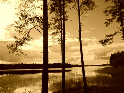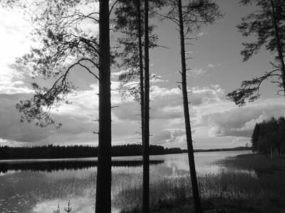 На картинке изображен живописный пейзаж с озером, окруженным лесом. На переднем плане видны несколько высоких деревьев с тонкими стволами, сквозь которые можно увидеть водную гладь озера. Вода спокойная, отражает небо и облака. Небо частично покрыто облаками, но заметна яркая синь, что создает контраст с темными силуэтами деревьев. Вдали виден лесной массив, который окружает озеро. Картина создает ощущение спокойствия и умиротворения, типичного для природы.