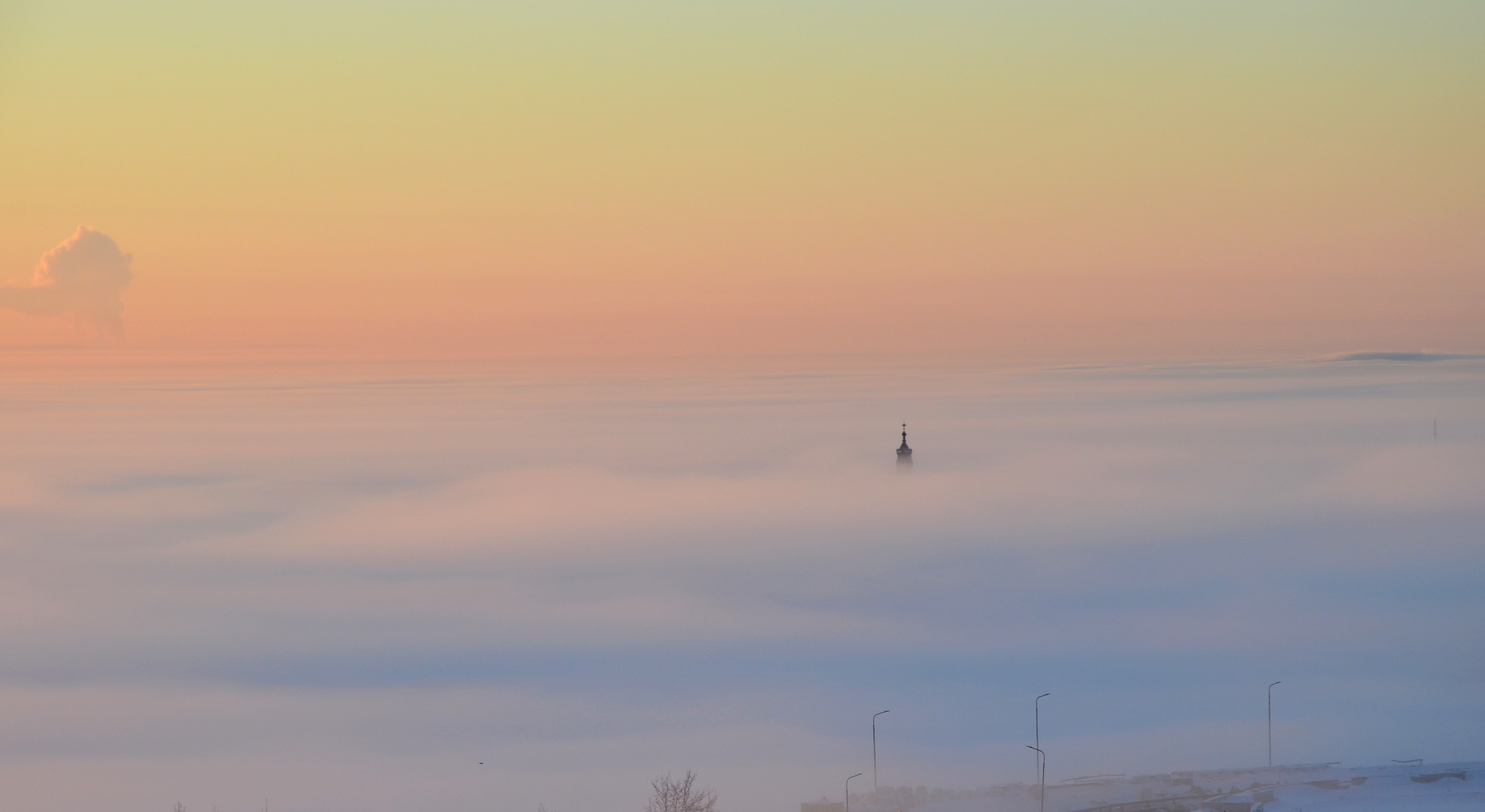 На картинке изображен пейзаж на рассвете или закате, с мягким, пастельным небом, переходящим от желтого к оранжевому и розовому цветам. Внизу изображен густой туман или облака, которые почти полностью скрывают землю. Из тумана выступает верхушка башни или колокольни, создавая впечатление, что она парит в облаках. Внизу, под туманом, видны очертания дороги с несколькими уличными фонарями. Вся сцена выглядит спокойной и умиротворенной, с мягкими, приглушенными цветами.
