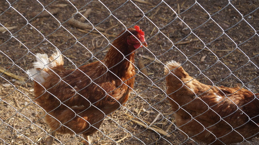 На картинке изображены две коричневые курицы, находящиеся за металлической сеткой. Они стоят на земле, покрытой соломой и сухими листьями. Одна из куриц повернута боком и виден её красный гребень, другая также боком, но её голова не видна. Сетка, которая их окружает, образует ромбовидную структуру и находится на переднем плане изображения.