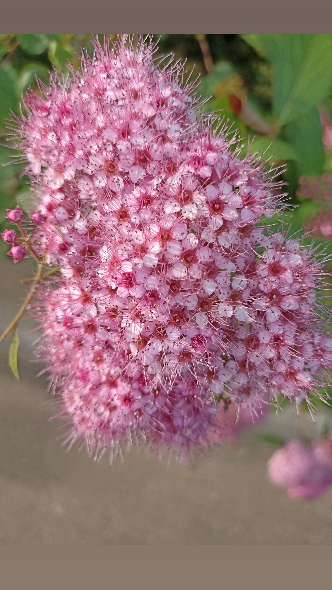 На картинке изображено крупное соцветие розовых цветов. Цветы имеют пушистую текстуру и собраны в плотную гроздь. Каждый цветок состоит из множества мелких лепестков, создающих объемный вид. На заднем плане видны зеленые листья растения.