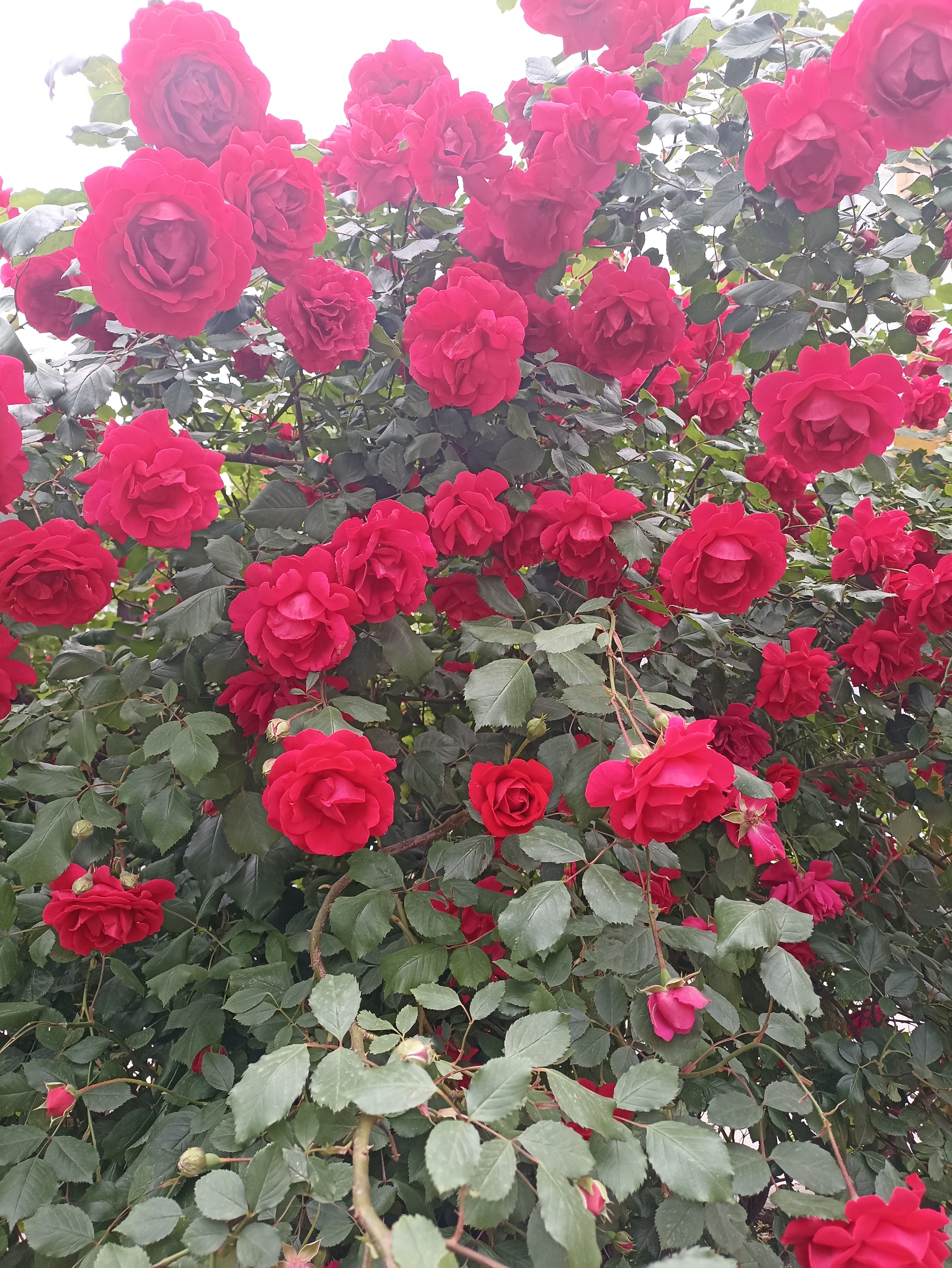 На картинке изображены яркие красные розы на кусте. Цветы густо покрывают ветви, создавая пышный и живописный вид. Листья темно-зеленые, что создает контраст с красными лепестками роз.