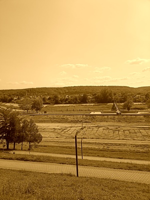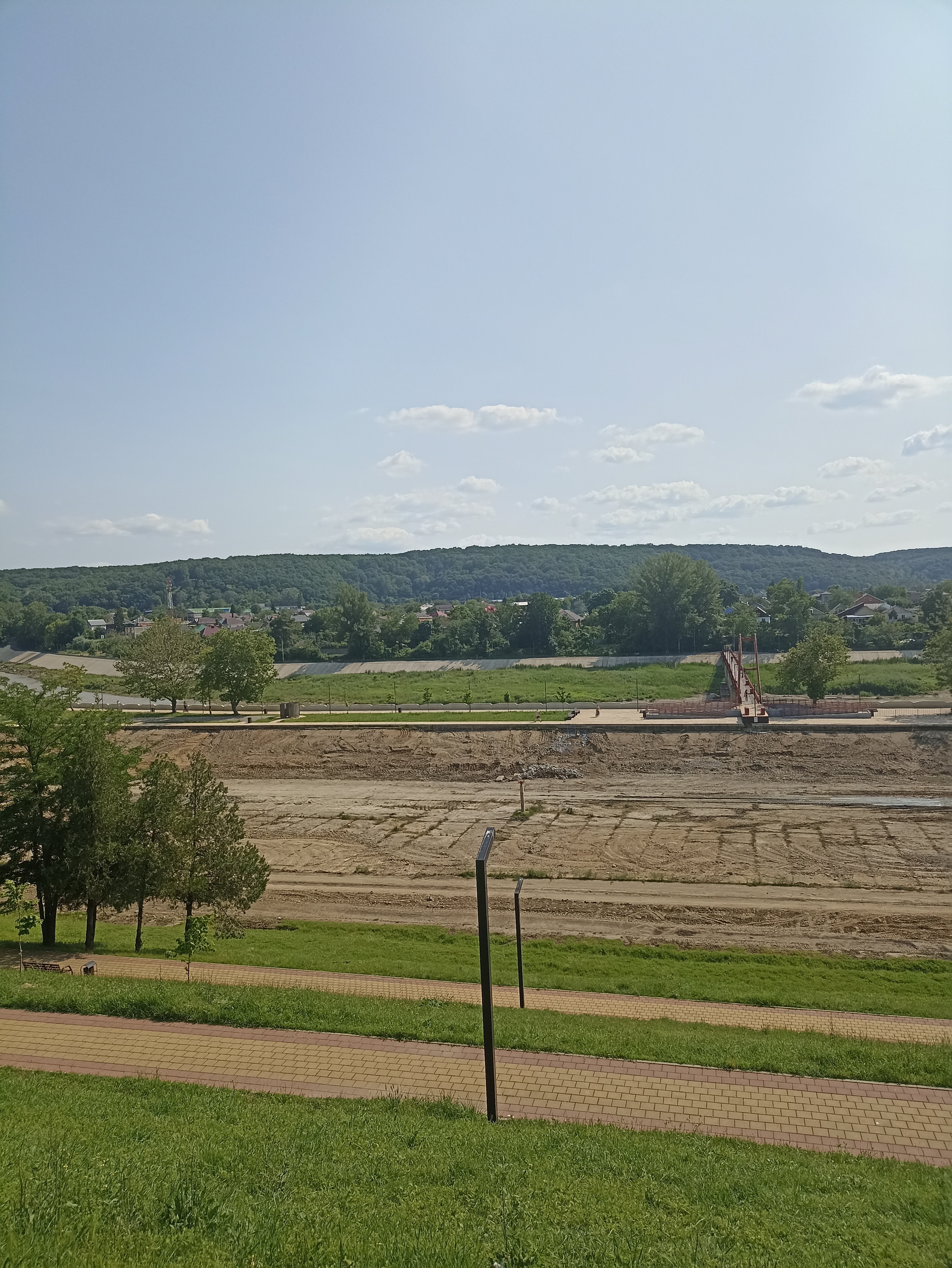 На картинке изображен пейзаж с открытой местностью. На переднем плане видна зелёная трава и дорожка, вымощенная плиткой. В центре проходит песчаная или земляная полоса, возможно, это подготовка к строительству или благоустройству. Вдалеке виднеется мост или пешеходная дорожка, ведущая через эту полосу. За ней расположены деревья и кустарники, а ещё дальше — зелёные холмы или лесистая местность. Небо ясное с небольшими облаками.
