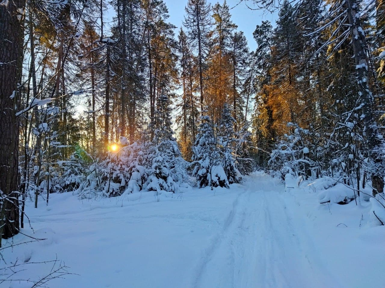 На картинке изображен зимний лес. Вся земля покрыта толстым слоем снега, и деревья также покрыты снегом. Высокие сосны и ели стоят вдоль заснеженной тропинки, которая уходит вдаль. Солнце находится низко на горизонте, его лучи пробиваются сквозь деревья, окрашивая верхушки в теплые оттенки оранжевого и золотого цвета. Сцена выглядит очень спокойной и умиротворяющей, передавая ощущение холодного зимнего утра или вечера.