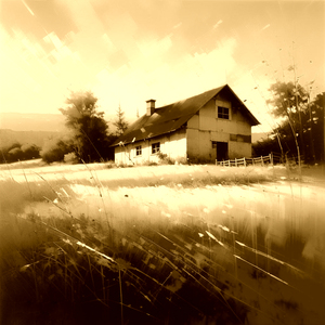 На картинке изображен дом в сельской местности. Дом имеет белые стены и крышу красного цвета. Он стоит посреди живописного пейзажа с полями и деревьями. Поля и трава имеют яркие, насыщенные цвета, преимущественно красные и оранжевые, что создает эффект осеннего времени года. Вдалеке виднеются горы и голубое небо с легкими облаками. Картина выполнена в стиле, напоминающем импрессионизм, с яркими мазками и акцентом на цветовые контрасты.