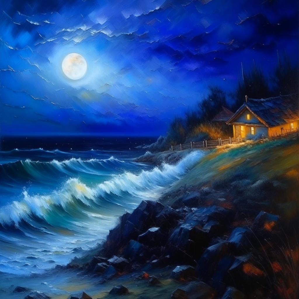 На картине изображена ночная сцена у моря. Полная луна ярко светит на небе, освещая волны, разбивающиеся о скалистый берег. Вдали виден деревянный дом с горящими окнами, создающими уютный и теплый свет. Дом окружен деревьями, которые слегка освещены лунным светом. Небо покрыто облаками, создающими драматическую атмосферу. Картина передает ощущение спокойствия и уединения.