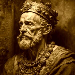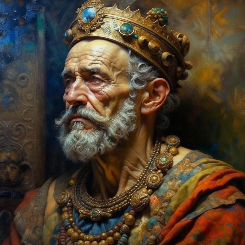 На картинке изображен пожилой мужчина с седыми волосами и бородой, одетый в роскошные одежды. На голове у него корона, украшенная драгоценными камнями. Мужчина выглядит серьезным и величественным. На шее у него несколько ожерелий, также украшенных камнями. Фон картины выполнен в темных тонах, что подчеркивает фигуру и придает изображению торжественность и значимость.
