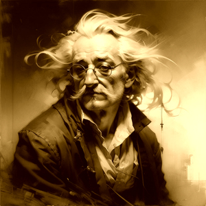 На картинке изображён пожилой мужчина с длинными седыми волосами и бородой. Его волосы растрепаны и развеваются, создавая ощущение движения. Мужчина носит очки с круглой оправой и имеет густые усы. Он одет в тёмную одежду, которая выглядит старой и изношенной. Фон картины размытый и абстрактный, с преобладанием тёмных и светлых тонов, что придаёт изображению драматический и загадочный характер.