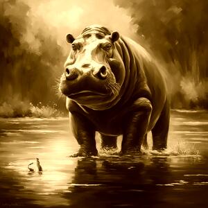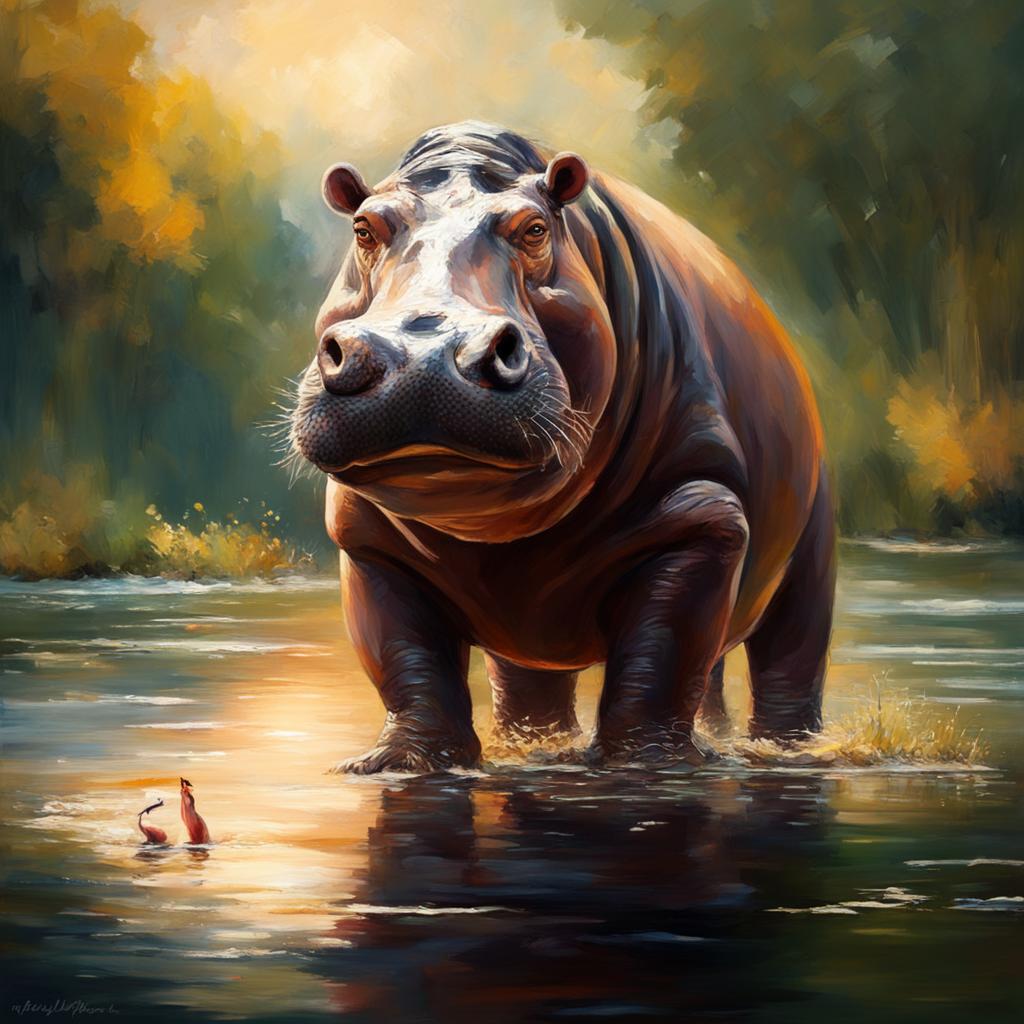 На картинке изображен гиппопотам, стоящий в воде. Вода окружает его ноги, а на заднем плане видны размытые деревья и кустарники, что создает впечатление, что сцена происходит в природной среде, возможно, на закате или рассвете, судя по теплым тонам освещения. Гиппопотам смотрит прямо вперед, его массивное тело и характерная форма головы отчетливо видны. В левой части изображения можно заметить маленькую красную фигурку, возможно, птицу или другую маленькую деталь на поверхности воды. Картина выполнена в реалистичном стиле с мягкими переходами и игрой света и тени.
